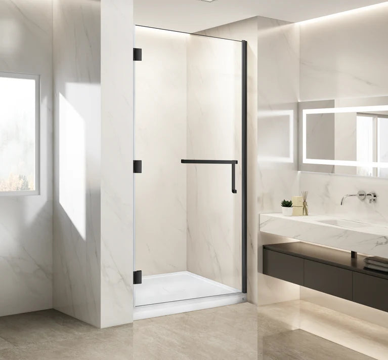 Une vitre de douche de 36" x 76" en verre trempé de 8 mm d’épaisseur, traité contre les cernes de savon et certifié pour sa sécurité.