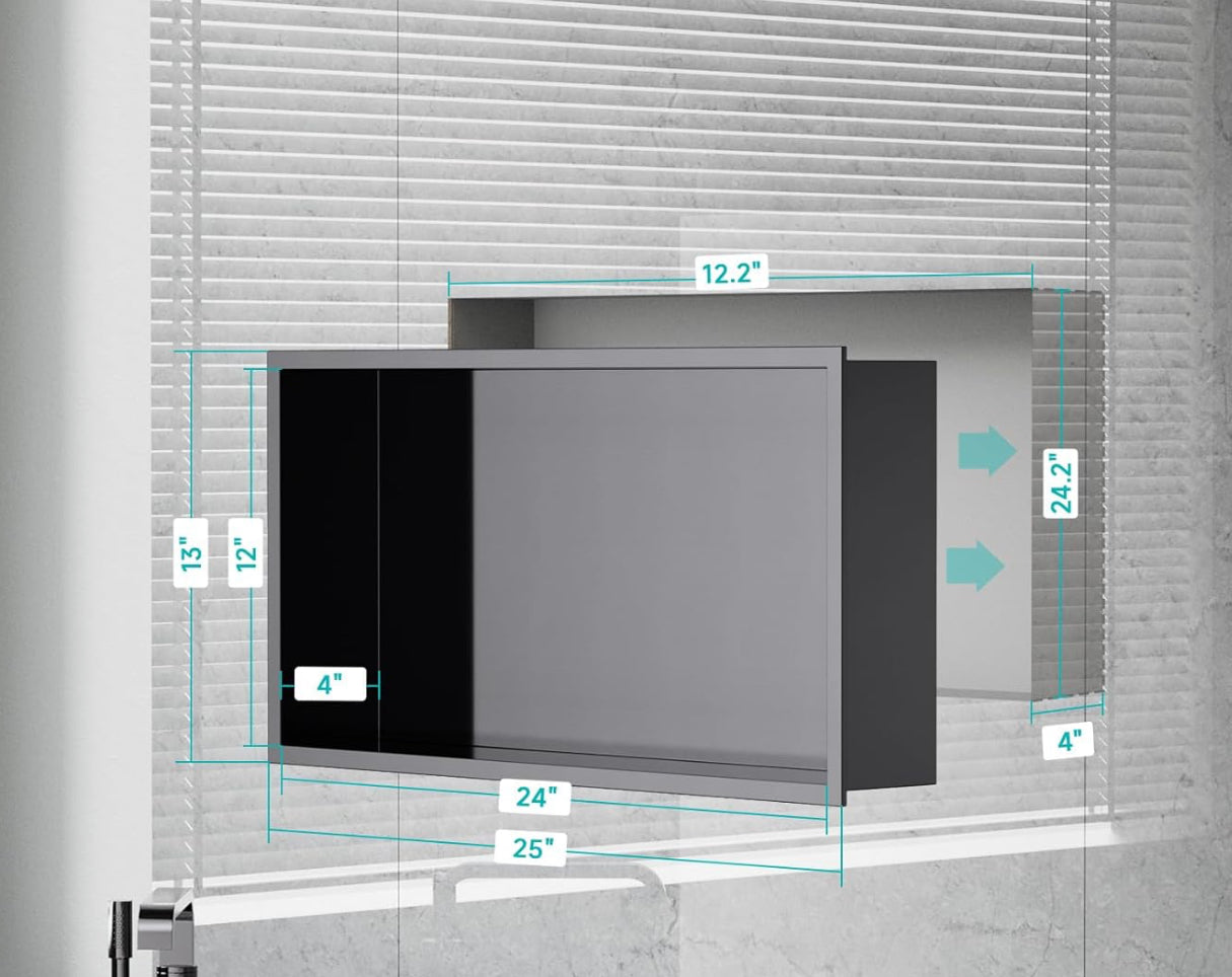 Dimensions de la niche murale encastrée : Dimensions intérieures : 24 po (L) x 12 po (H) x 4 po (P). Dimensions extérieures : 25 po (L) x 13 po (H) x 4 po (P). Son design encastré permet d’alléger visuellement l’espace tout en offrant un rangement pratique et esthétique.