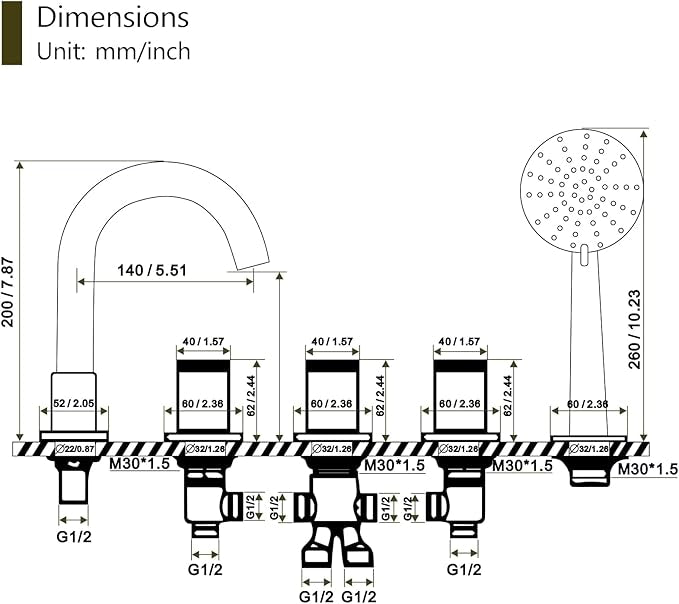 Robinet romain à 5 trous avec 3 poignées : Contrôlez séparément l’eau chaude et l’eau froide grâce aux deux poignées latérales, et utilisez la poignée de déviation centrale pour passer du bec de baignoire à la douchette.