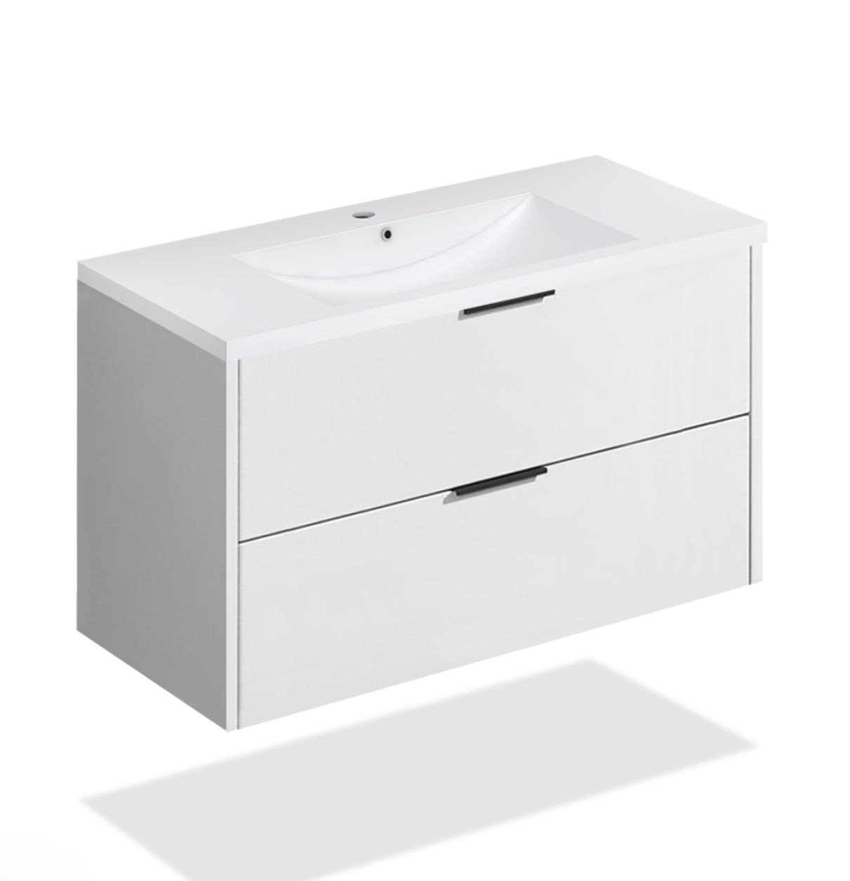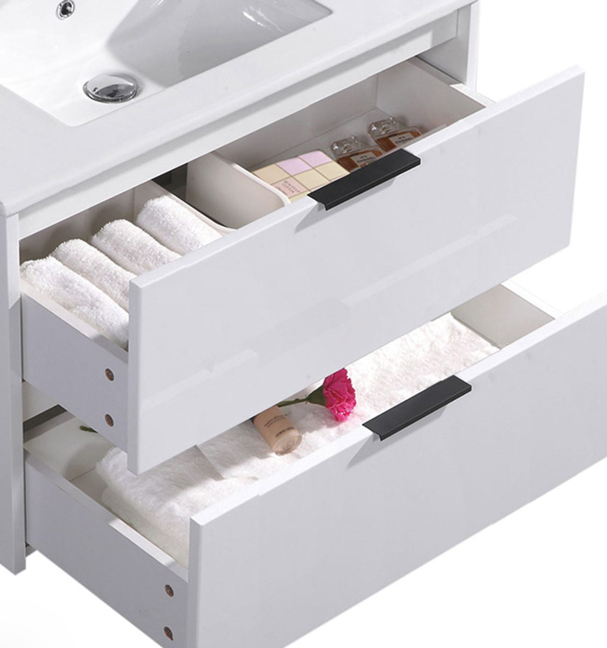 Ajoutez une touche moderne et raffinée à votre salle de bain avec cet ensemble de vanité murale de 36 pouces. Son fini blanc lustré et son design linéaire épuré s’agencent parfaitement à un décor minimaliste, tandis que les poignées noires créent un joli contraste contemporain. Dotée de deux tiroirs spacieux, cette vanité vous permet de garder vos essentiels bien organisés et à portée de main.